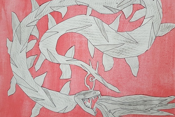 Nachdem die Klasse 7d sich das Fabelwesen „Der Ausbrecher“ (1925) des Künstlers Max Ernst näher angeschaut hatte, wurden allerlei Gegenstände und Oberflächen im Schulhaus mittels der Abriebtechnik der Frottage untersucht. Ziel war es, die Haut eines selbst entworfenen Drachens spannungsvoll zu gestalten. Die Arbeit von Anne-Sophie Kämmerer ist besonders gelungen: sie zeigt einen schlangenartigen, feuerspeienden Drachen, dessen Grauwerte und zarte Strukturen sich prima vom blassroten Hintergrund abheben.