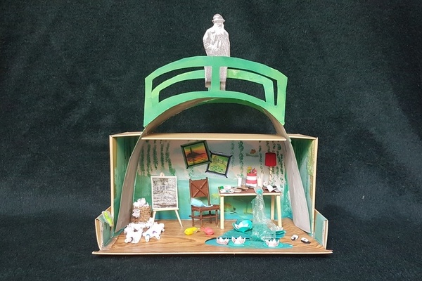 Die Gemälde des Impressionisten Claude Monets sind vielen bekannt, allen voran seine Seerosenbilder. Die Schülerin Annabel Stuber aus der Klasse 7d hat sich vor den Sommerferien des zurückliegenden Schuljahres mit der Frage beschäftigt, wie wohl das Atelier des Künstlers ausgesehen haben mag. In unserem Kunstwerk des Monats September dürfen wir in Monets privates Reich eintreten. Annabel hat sich so einige fantastische Details ausgedacht, die einen staunen lassen. So thront Monet über allem auf der so häufig von ihm gemalten, gebogenen japanischen Brücke oder eine umgekippte Farbtube ergießt sich in einen blühenden Seerosenteich.