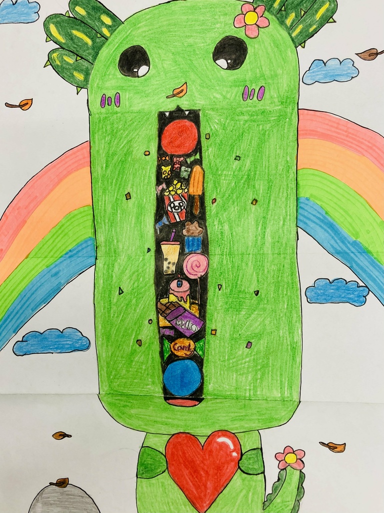 In dieser Aufgabe der 6c war das Aufreißen der Klappe im Bild ein „Muss“. Durch Faltung eines Din A3-Blattes entstanden zwei verschiedene Bildebenen, die durch einfaches Aufklappen den Bildraum vergrößern oder verkleinern. Eine freundlich oder unfreundlich dreinschauende Cartoonfigur soll eine lustige oder gruselige Überraschung in ihrer Klappe sichtbar werden lassen.