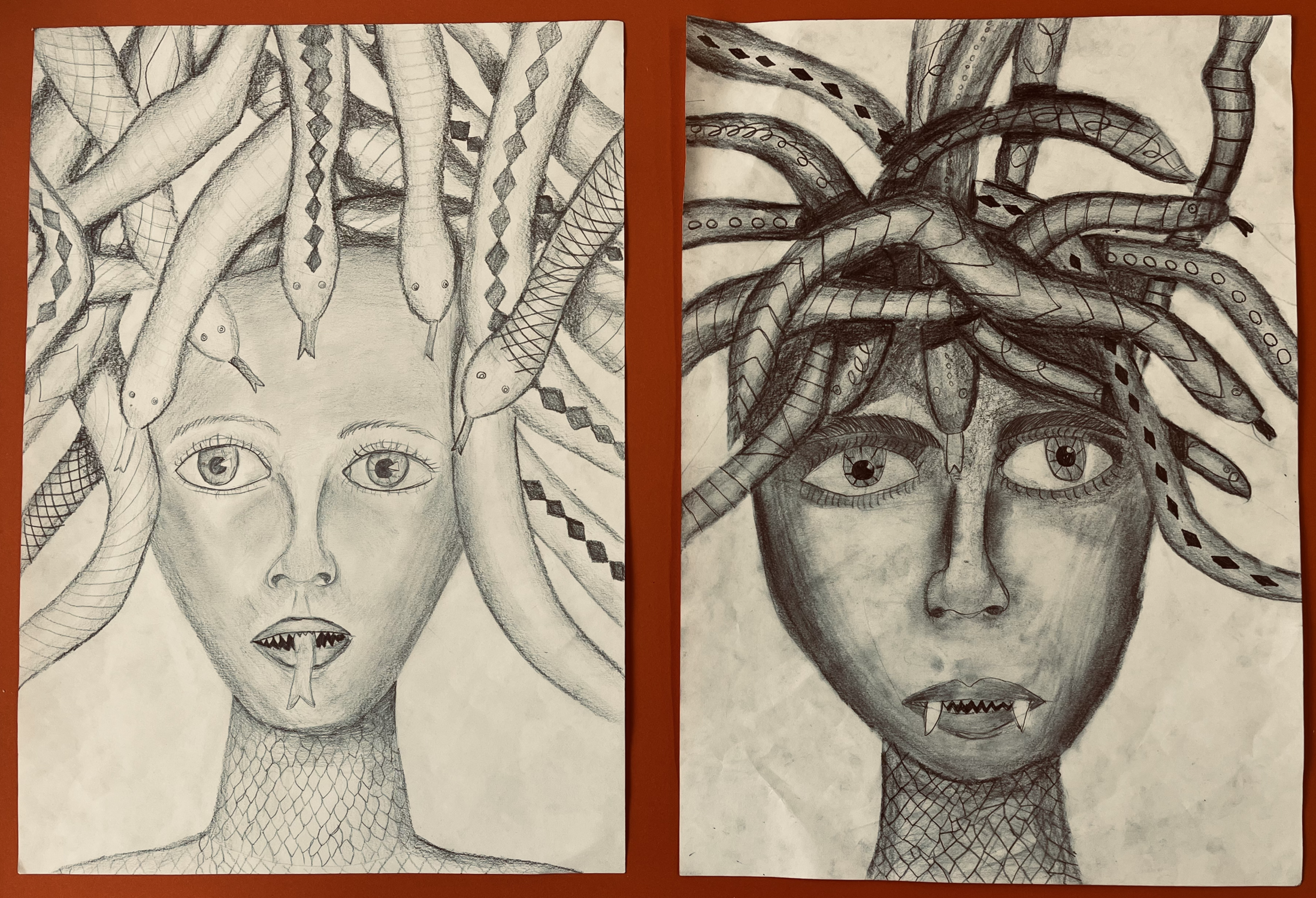 „Das Haupt der Medusa“ ist ein beliebtes Thema aus der griechischen Mythologie, welches immer wieder in den verschiedenen Epochen der Kunstgeschichte mit ganz eigenen künstlerischen Interpretationen bearbeitet wurde. Inspiriert durch die berühmten Beispiele von Caravaggio und Rubens zeichneten die SchülerInnen der Klasse 7B eine Verwandlung der schönen Medusa in ein furchterregendes Monster mit dem typischen Schlangenhaar auf ihrem Kopf. Ganz besonders gelungen sind die Zeichnungen von Maja Sundermann - Schulte Spechtel und Hannah Tempel, die wir stolz zum Abschluss des Jahres als Kunstwerke des Monats Dezember präsentieren dürfen.