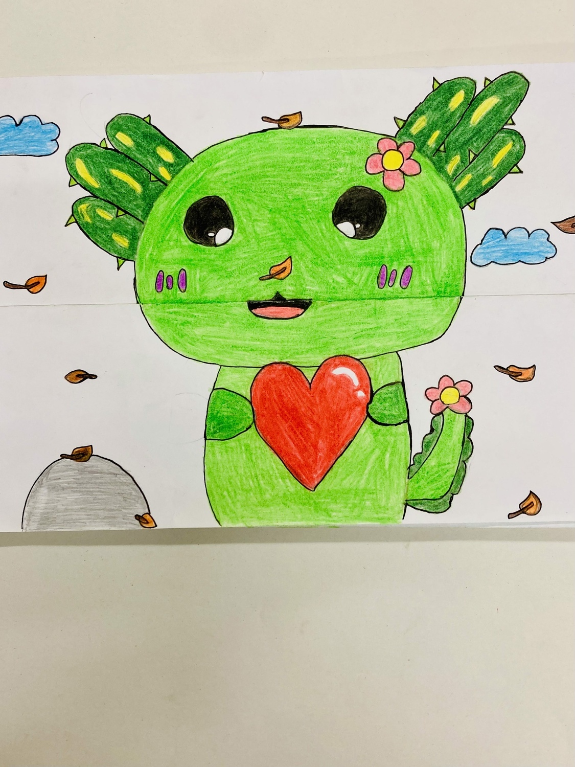 In dieser Aufgabe der 6c war das Aufreißen der Klappe im Bild ein „Muss“. Durch Faltung eines Din A3-Blattes entstanden zwei verschiedene Bildebenen, die durch einfaches Aufklappen den Bildraum vergrößern oder verkleinern. Eine freundlich oder unfreundlich dreinschauende Cartoonfigur soll eine lustige oder gruselige Überraschung in ihrer Klappe sichtbar werden lassen.